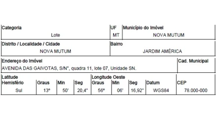 AVENIDA DAS GAIVOTAS,N. 00 QD 11, LT 07, JARDIM AMERICA - CEP: 78454-116, NOVA MUTUM - MATO GROSSO