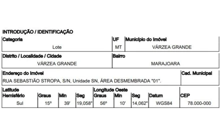 RUA SEBASTIÃO STROPA (ANTIGA RUA PANTANEIRA),N. 00 ÁREA DESMEMBRADA 01, SANTA ISABEL - CEP: 78150-434, VARZEA GRANDE - MATO GROSSO