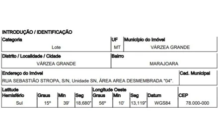 RUA SEBASTIÃO STROPA (ANTIGA RUA PANTANEIRA),N. 00 ÁREA DESMEMBRADA 04, SANTA ISABEL - CEP: 78150-434, VARZEA GRANDE - MATO GROSSO