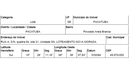 RUA A,N. 00 QD 04, LT 21, POVOADO AREIA BRANCA - CEP: 49970-000, PACATUBA - SERGIPE